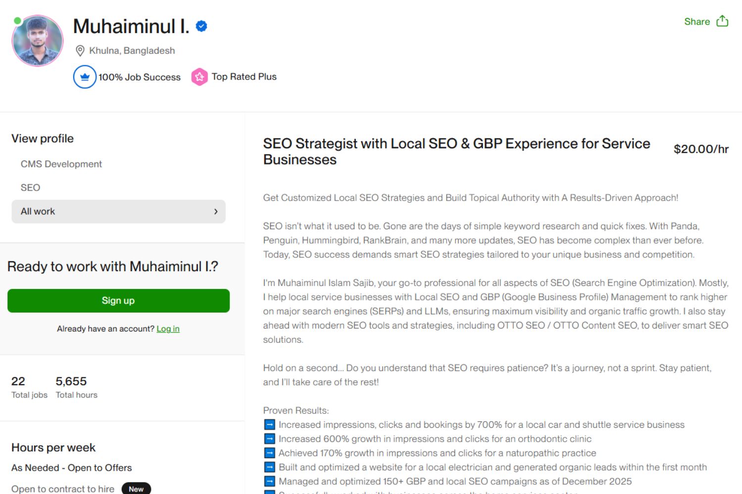 Bangladesh has many skilled SEO professionals, but Muhaiminul Islam Sajib stands out due to his proven track record, data-driven approach, and measurable results worldwide. As a Top-Rated Plus SEO Strategist on Upwork with a 100% Job Success Rate, he has successfully managed SEO projects for over 200 businesses and optimized more than 300 websites across various industries.